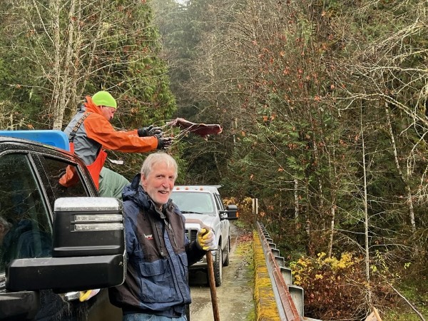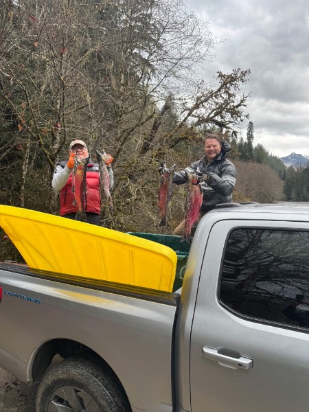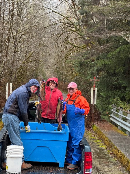Delivering salmon carcasses up river by truck and dispersing by hand.